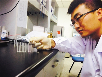 12日,北京智云達(dá)食品安全檢測消費(fèi)者體驗(yàn)中心,實(shí)驗(yàn)人員先對泡椒鳳爪樣品進(jìn)行了雙氧水快速檢測,結(jié)果顯示六種樣品中均未含雙氧水。隨后進(jìn)行的防腐劑山梨酸測試結(jié)果顯示,一種樣品溶液為粉紅色(圖)。