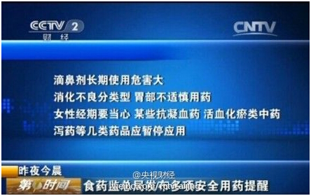 @央視財經(jīng)【警惕!食藥監(jiān)總局:滴鼻劑、甘草片不能長期使用!】國家食藥監(jiān)總局提醒消費者:滴鼻劑長期使用危害大;女性經(jīng)期要當心,某些抗凝血藥、活血化瘀類中藥、瀉藥等幾類藥品應暫停應用。此外,復方甘草片易成癮,不能長期使用;氨基酸也并不能補腦,攝入多了還會加重肝腎負擔。
