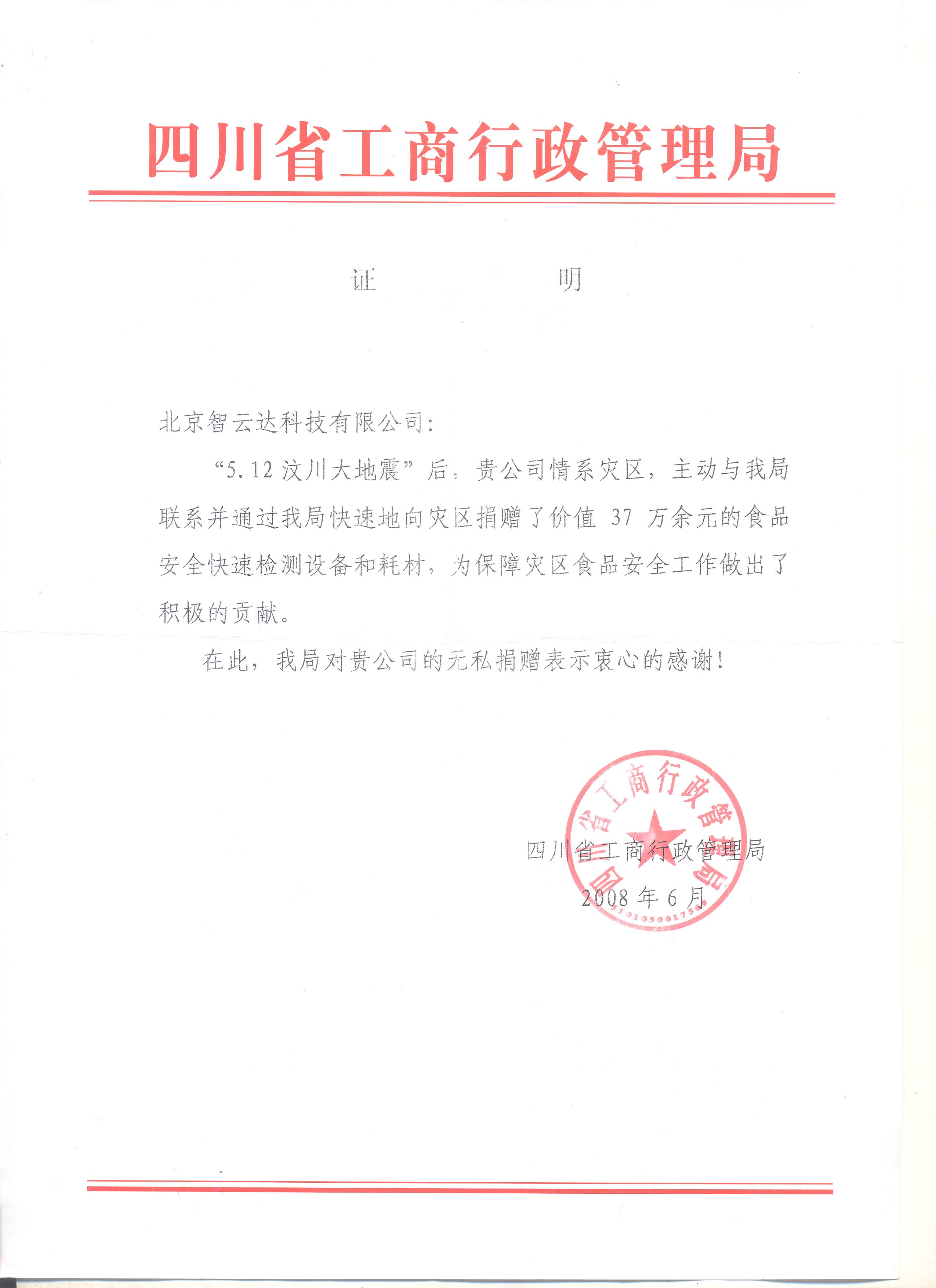 北京智云達科技有限公司作為一家專業從事食品安全快速檢測產品及配套軟件研發、生產、銷售于一體的高新技術企業,在了解到這個情況之后,主動聯系四川省工商局,向災區人民捐贈了價值37萬余元的食品安全快速檢測設備和耗材,為保障災區食品安全做出了積極的貢獻,受到了四川省工商局的高度贊揚。