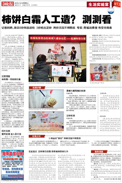 2016年12月08日9:00,北京智云達科技股份有限公司(以下簡稱“北京智云達”)與法制晚報攜手制作走進勁松街道八棵松社區活動,為消費者免費檢測柿餅中是否含有葡萄糖和果糖、柿霜中是否含有淀粉。