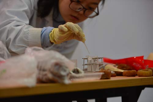 北京智云達技術工程師楊老師和王老師首先將柿餅表面的白霜沖洗到水中,再通過使用北京智云達自主研發生產的快速檢測產品:果糖和葡萄糖快速檢測試劑,對樣品溶液的果糖和葡萄糖含量進行檢測,而淀粉含量通過碘溶液進行測定。