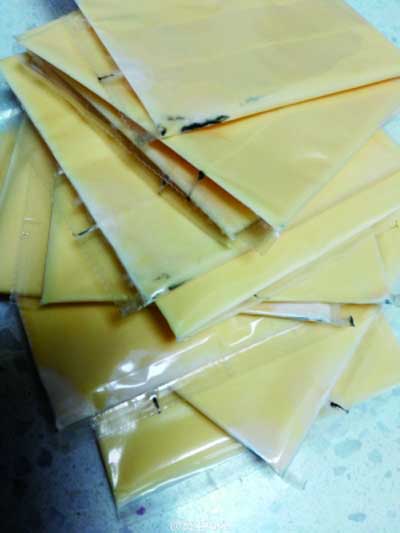 “正月初三的時(shí)候,我在超市內(nèi)購(gòu)買三元芝士片,正好趕上超市有活動(dòng),買兩袋贈(zèng)送了一袋。”果女士稱,將商品拿回家之后,她就將芝士片放在了冰箱里,一直沒(méi)有拿出來(lái)。“冰箱一直沒(méi)有斷電,都是正常制冷的。”她稱,直到昨天,她從冰箱內(nèi)將芝士片拿出來(lái)準(zhǔn)備食用,卻發(fā)現(xiàn)一個(gè)袋子中的芝士片已經(jīng)發(fā)霉了。“發(fā)霉的芝士片是贈(zèng)送的那一袋,里面的每一片都有一片綠色霉點(diǎn)。其他兩袋是正常的,沒(méi)有壞。我觀察霉變的芝士片上都有一道黑線,黑線的一側(cè)都有霉菌,要是我不小心吃到肚子里,肯定是要鬧肚子的。”