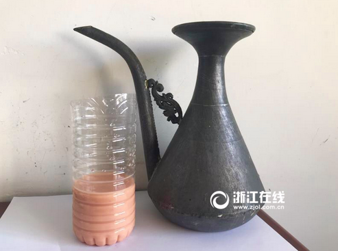 圖為害得一家人全部鉛中毒的錫壺,以及里面裝過的酒(已變色)。照片由患者提供