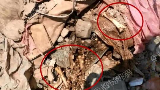 圖片上的這些肉,是有人從垃圾填埋場里三、四米的深坑里刨出來的,腐爛的雞腳、雞翅、牛肉、散發著腐臭味,這些肉從哪兒來,將到哪去?
