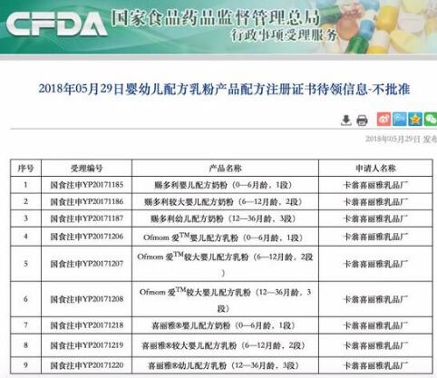 根據通告,卡翁喜麗雅乳品廠申報的賜多利、Ofmom?愛 、喜麗雅®共計三個系列嬰幼兒配方奶粉的配方注冊,總局給予“不批準”的公開批復。