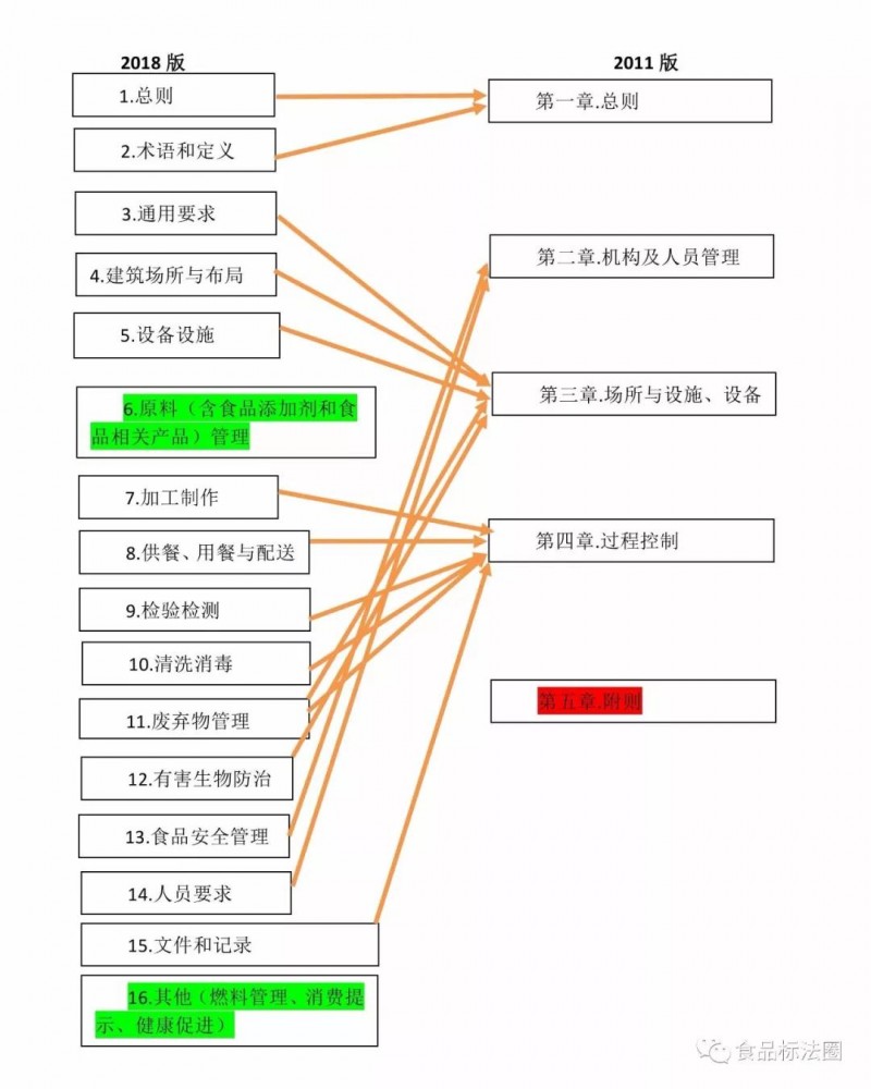 2011版《餐飲服務食品安全操作規范》分成了五章,分別是:第一章:總則、第二章:機構及人員管理、第三章:場所與設施、設備、第四章:過程控制、第五章:附則。