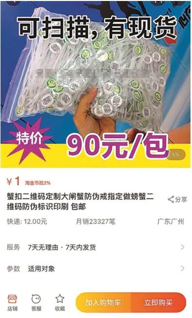 商家所售賣的防偽環(huán)大多都為橢圓形塑料圓環(huán),一面印有陽澄湖大閘蟹地理標志產品專用標志圖案,另一面為二維碼。價格從一分到五分不等,買得越多越便宜。