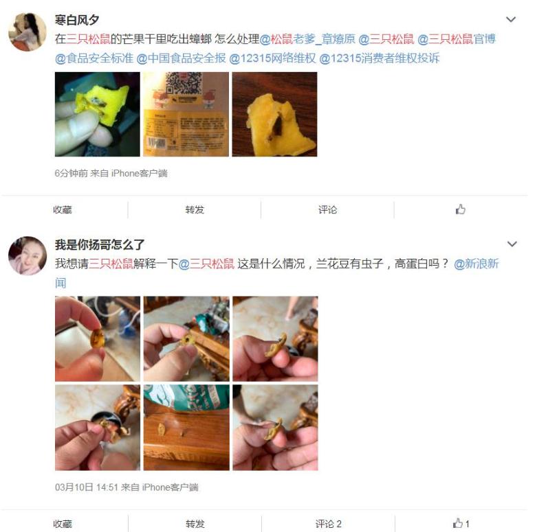 中新經(jīng)緯客戶端在微博上看到,不僅是劉洋和阿維,其他消費者也表示曾在三只松鼠的產(chǎn)品中吃出過蟲子。