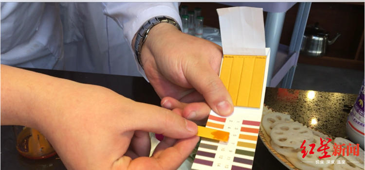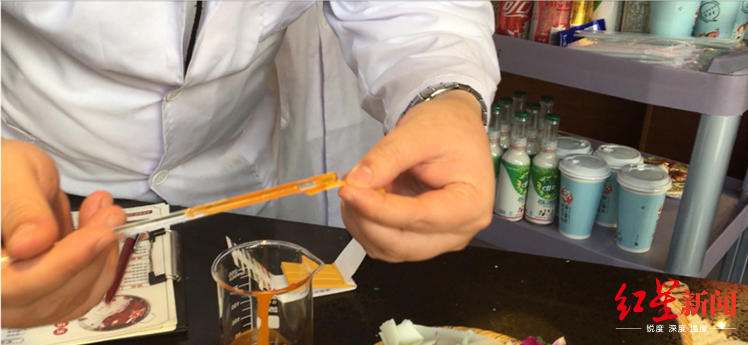 “如果呈現出來是5以下,表示是新油,如果6以上,就是老油?!?月11日,成都一家火鍋串串店用pH試紙