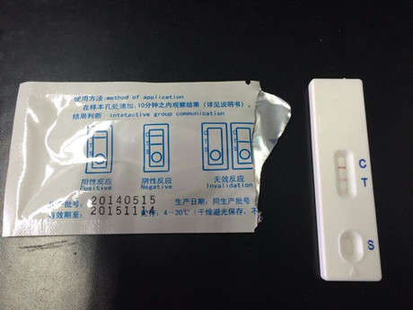 3、吸取待測(cè)樣品溶液,緩慢滴加80~100μl(約3~4滴)樣品液于加樣孔中,開始計(jì)時(shí),在3~5分鐘內(nèi)讀取結(jié)果。