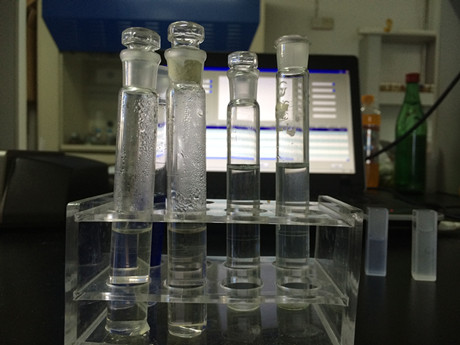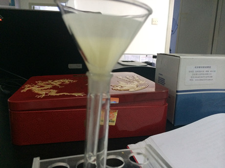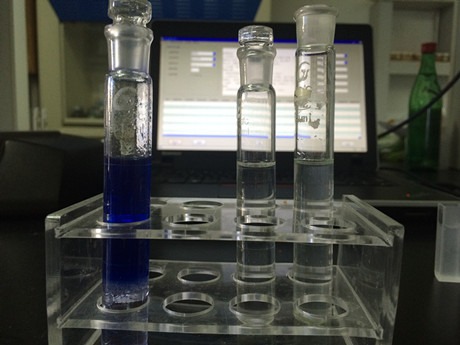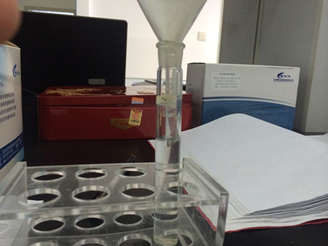 3、樣品管:取制備好的樣品液加入A溶液1mL,搖勻,加入三氯甲烷4mL,蓋上塞子,較為快速顛倒20次,靜置5min,取下層溶液進(jìn)行檢測(cè)。