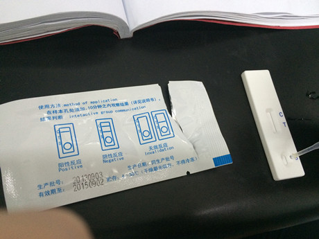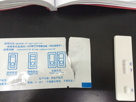 1、 從包裝袋中取出試紙卡,打開(kāi)后平放在桌面上,用吸管吸取待檢樣品溶液,滴加 3 滴于加樣孔中,加樣后開(kāi)始計(jì)時(shí)