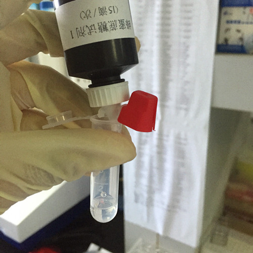 用0.2ml塑料吸管取待測液滴加1滴到另一離心管中,滴入15滴蔗糖試劑1,蓋上管蓋,上下搖動 6 次。