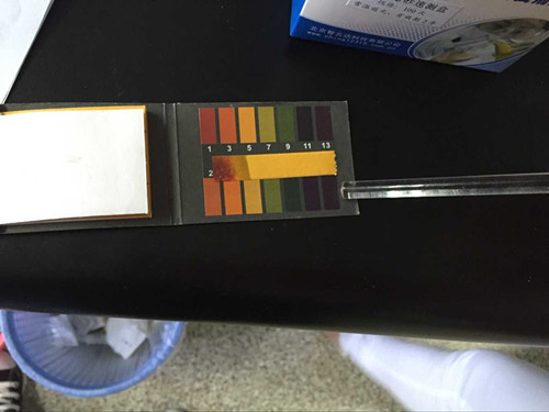 (2) 檢測 在試管中加入硼酸硼砂試劑使ph低于3,用硼砂試紙尖端沾取樣品溶液后取出,用電吹風吹干后觀察試紙變色情況。