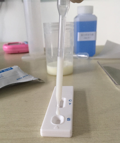 用干燥、潔凈的比色管盛放奶粉,用純凈水1:10稀釋(1份奶粉+10份純凈水),溶解后用于檢測(cè)。