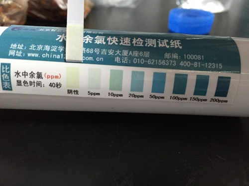 擦掉試紙邊緣多余液體,試紙塊朝上水平放置,40秒時與色卡比較,讀取結果。結果顯示余氯符合國家標準。