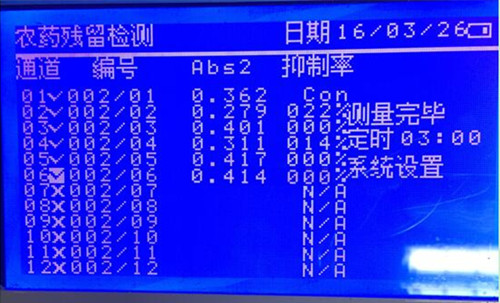 檢測結果如圖所示,結果以酶被抑制的程度,即抑制率表示。當果蔬樣品提取液對酶的抑制率為40~50%時,則表明被測樣品為可疑農殘超標樣品;當抑制率≥50%時,表示蔬菜中有高劑量有機磷或氨基甲酸酯類農藥存在,樣品為陽性結果。所以樣品中農藥殘留符合國家標準。