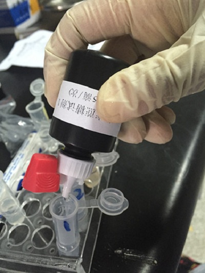 用0.2 mL塑料吸管取待測(cè)液滴加1滴到另一離心管中,滴入15滴蔗糖試劑1,蓋上管蓋,上下?lián)u動(dòng)6次。
